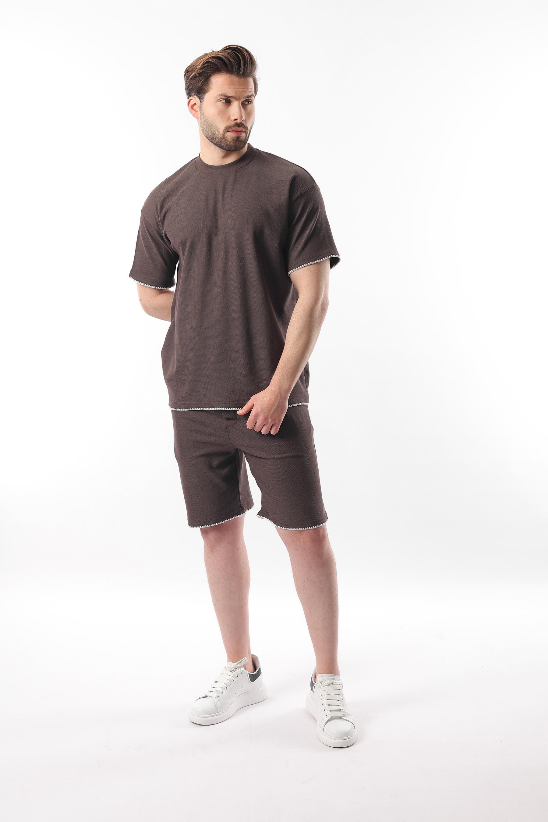 Kahverengi Nakış Detaylı Erkek Şort T-shirt Takım E7305
