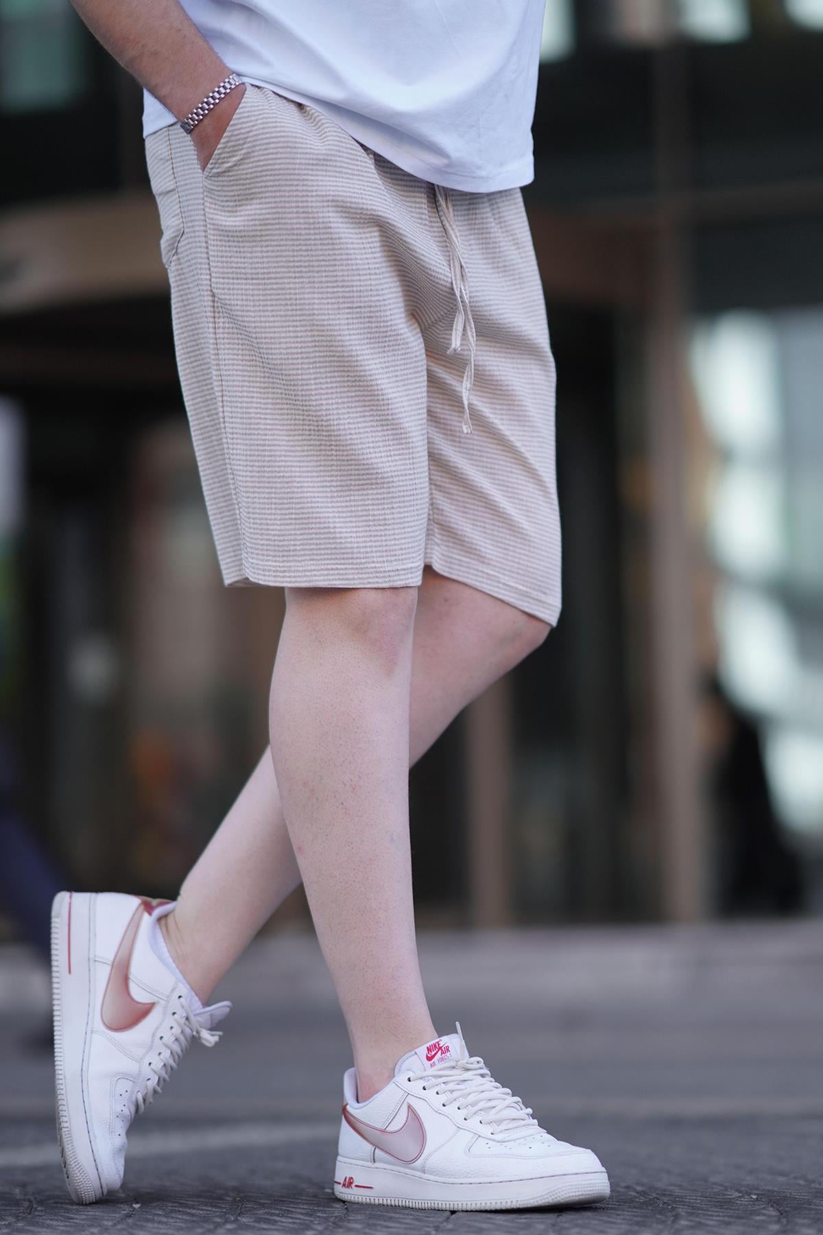 Bej Çizgili Beli Ayarlanabilir Pamuklu Keten Kısa Erkek Şort 6542