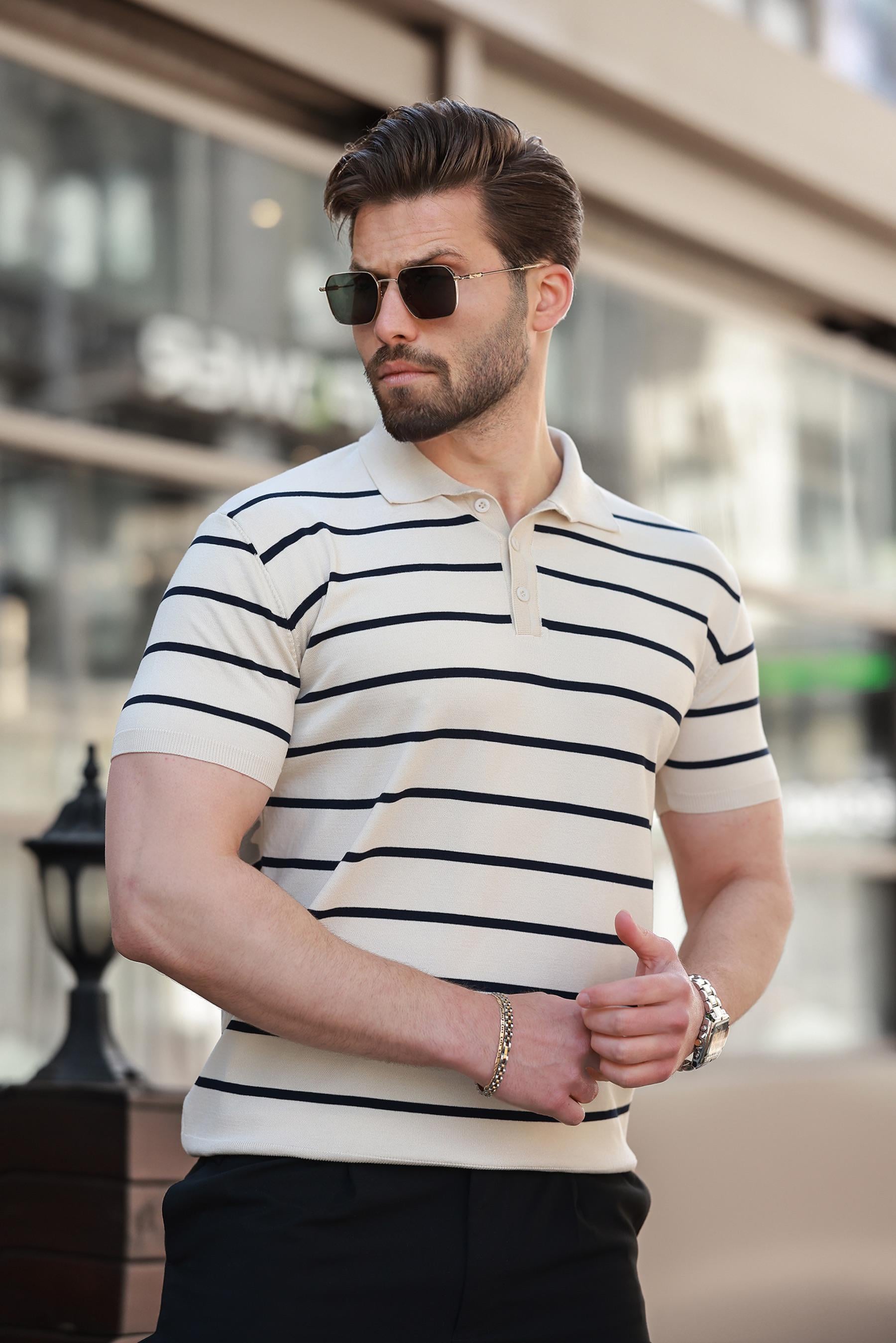Bej Çizgili Polo Yaka Erkek T-shirt E7405