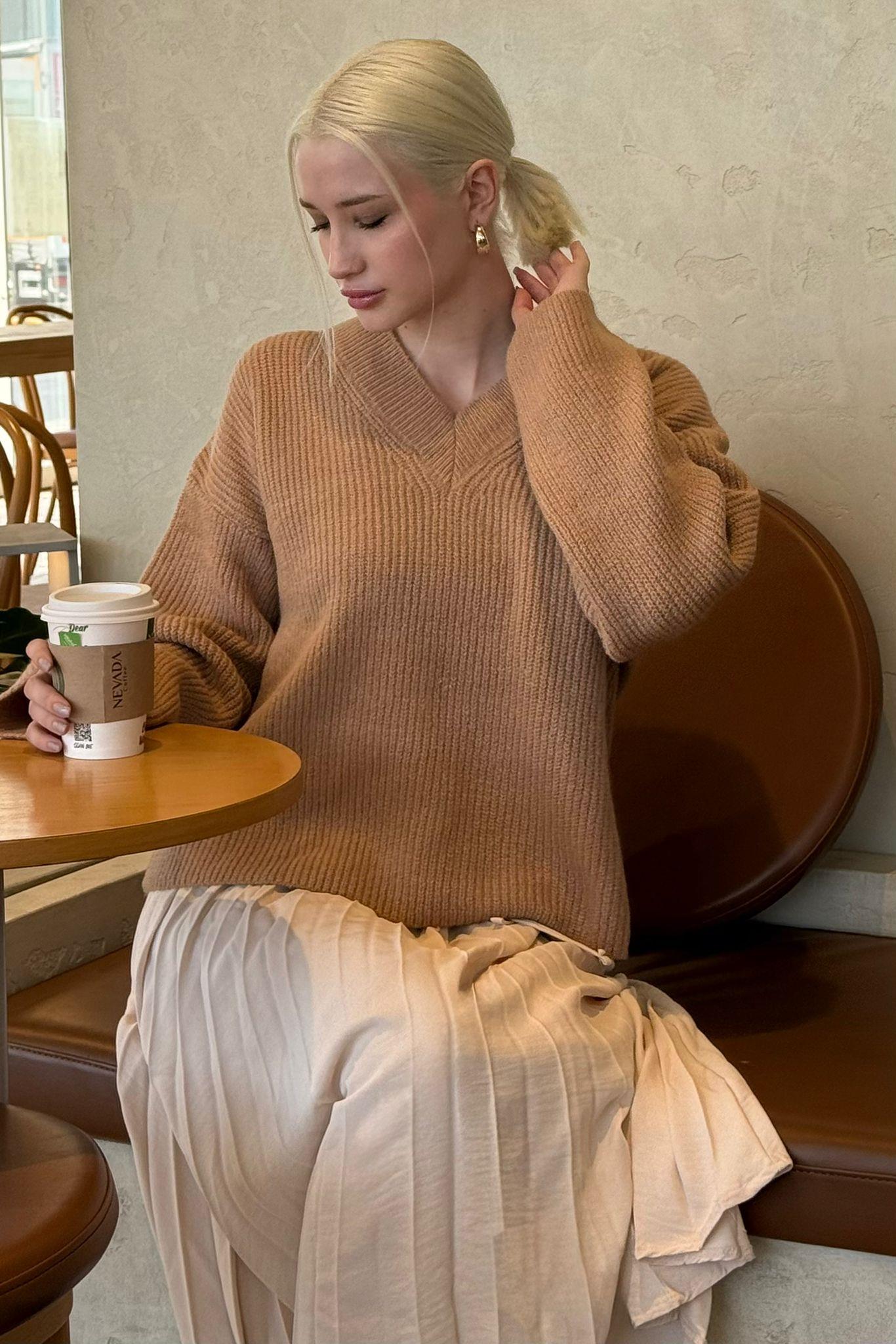 Camel V Yaka Triko Kadın Kazak Mg2501