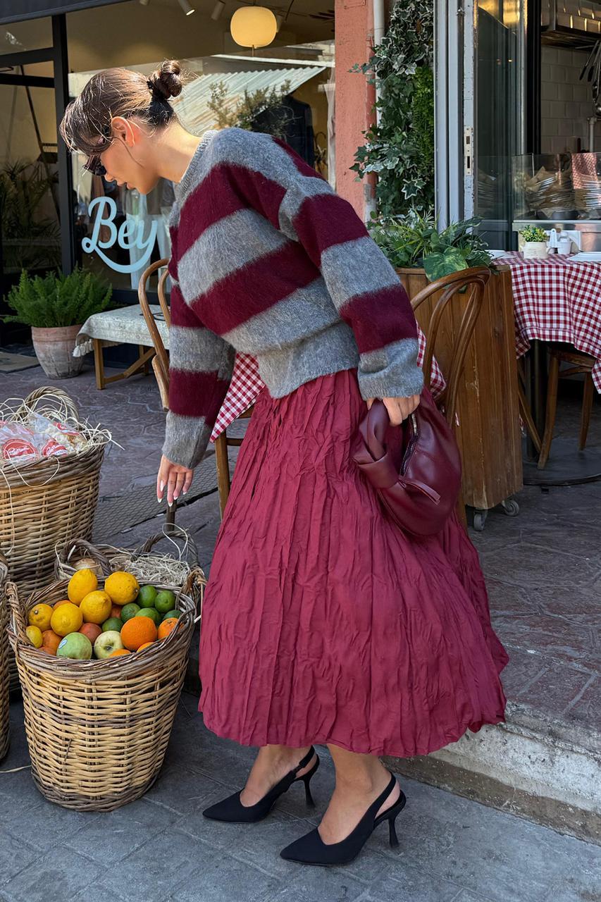 Bordo Bisiklet Yaka Çizgili Triko Kadın Kazak Mg2472
