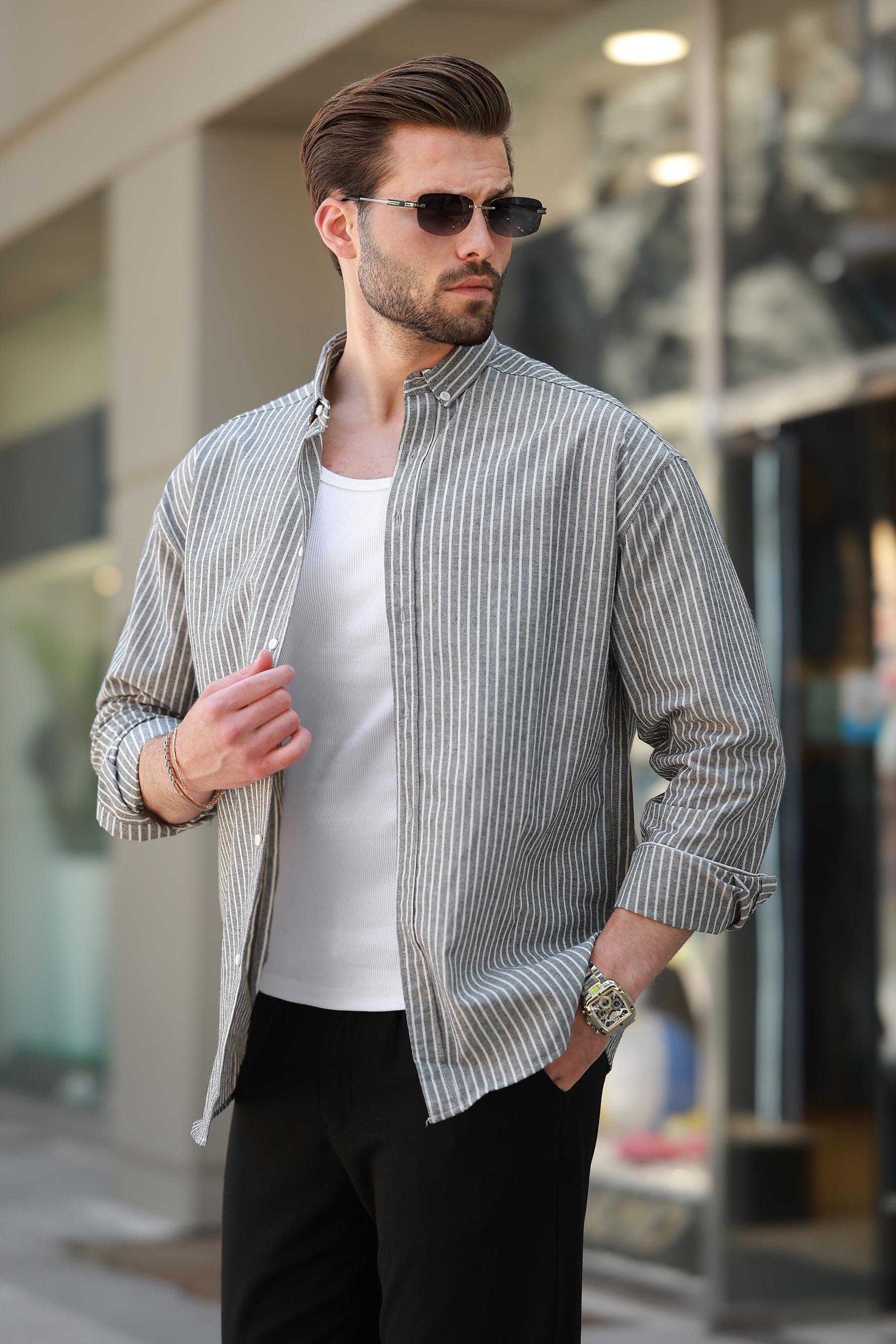 Füme Çizgili Uzun Kollu Pamuklu Erkek Gömlek 6746