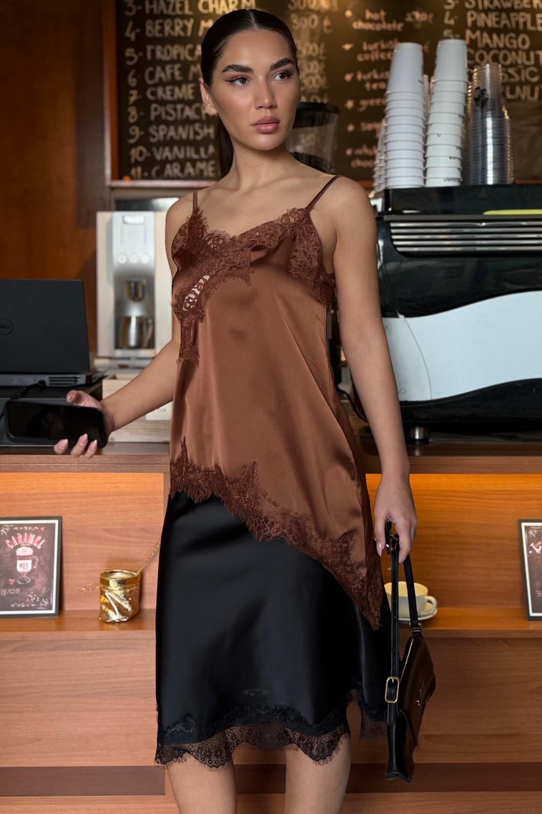 Kahverengi Dantelli Asimetrik Kesim Saten Bluz MG2694
