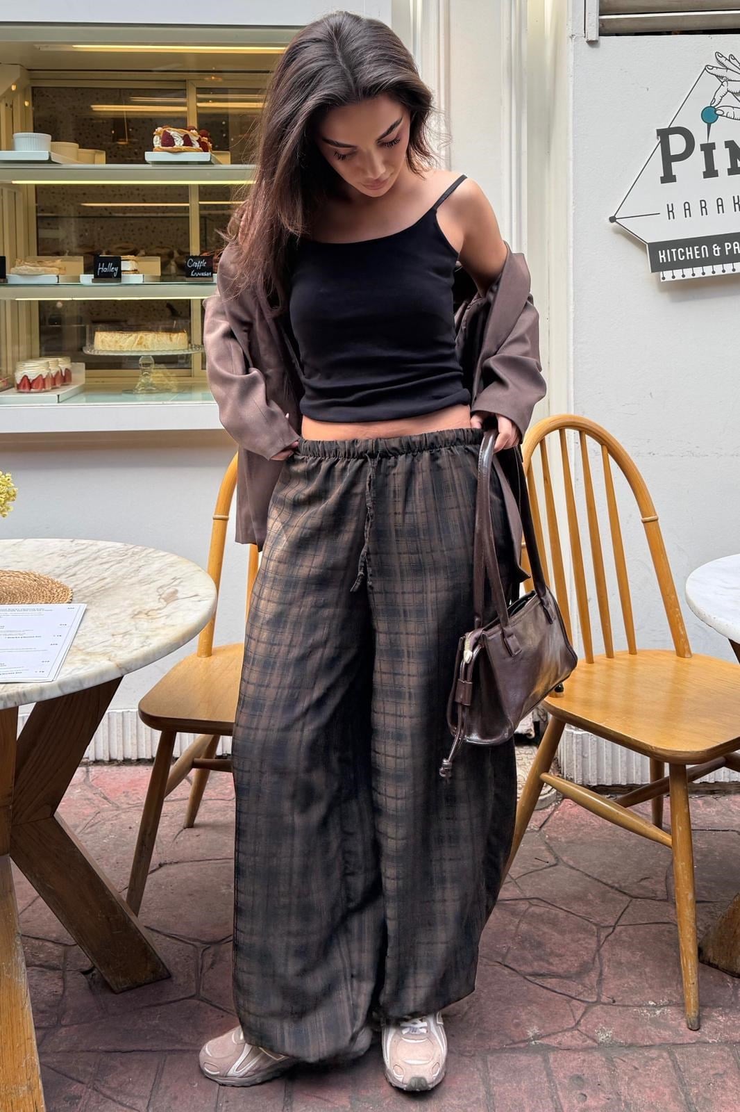 Kahverengi Ekose Desenli Yüksek Bel Balon Fit Kadın Pantolon MG2726