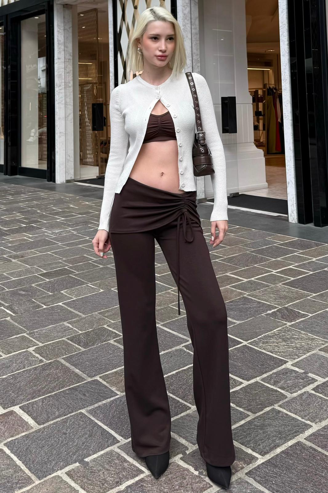 Kahverengi Modal Yumuşak Büzgü Bağcık Detaylı Flare Kadın Pantolon MG2562
