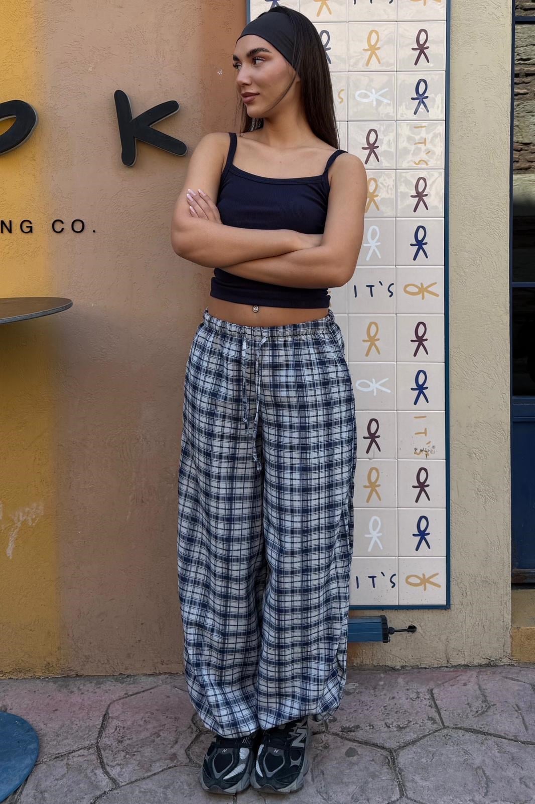 Lacivert Ekose Desenli Yüksek Bel Balon Fit Kadın Pantolon MG2726