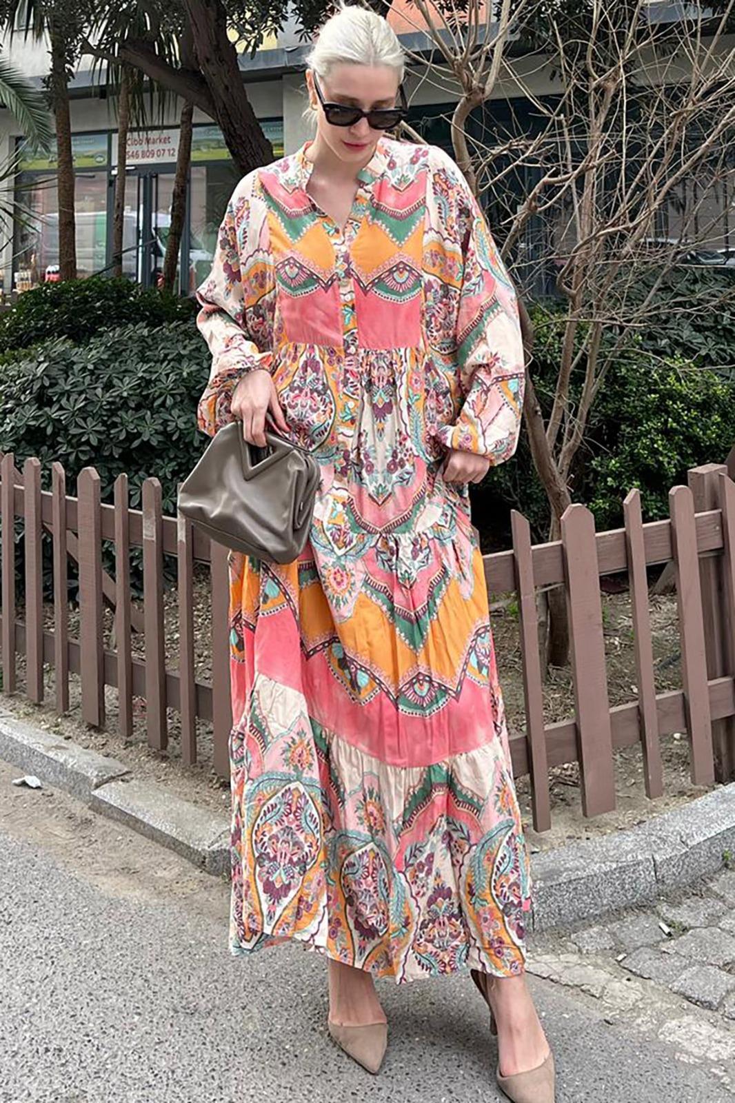 Pembe Bilekleri Lastikli Yarım Düğmeli Hakim Yaka Çiçekli Elbise MG2028