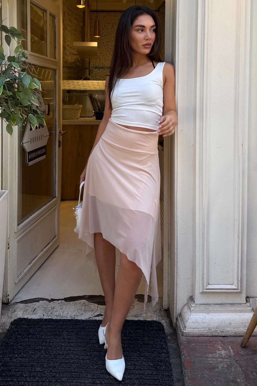Pudra Şifon Asimetrik Kesim Midi Etek MG2777