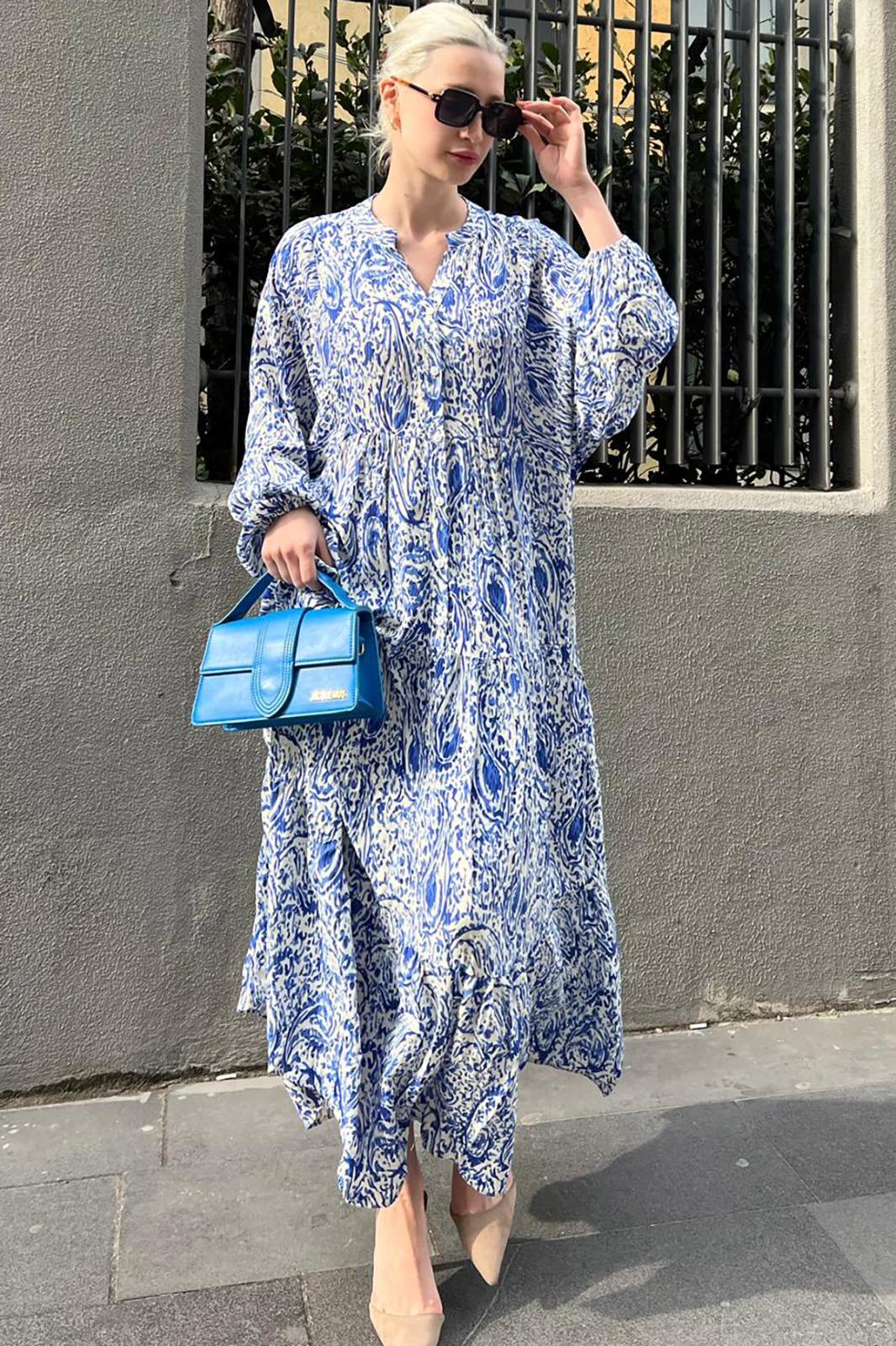 Saks Bilekleri Lastikli Yarım Düğmeli Hakim Yaka Çiçekli Elbise MG2028