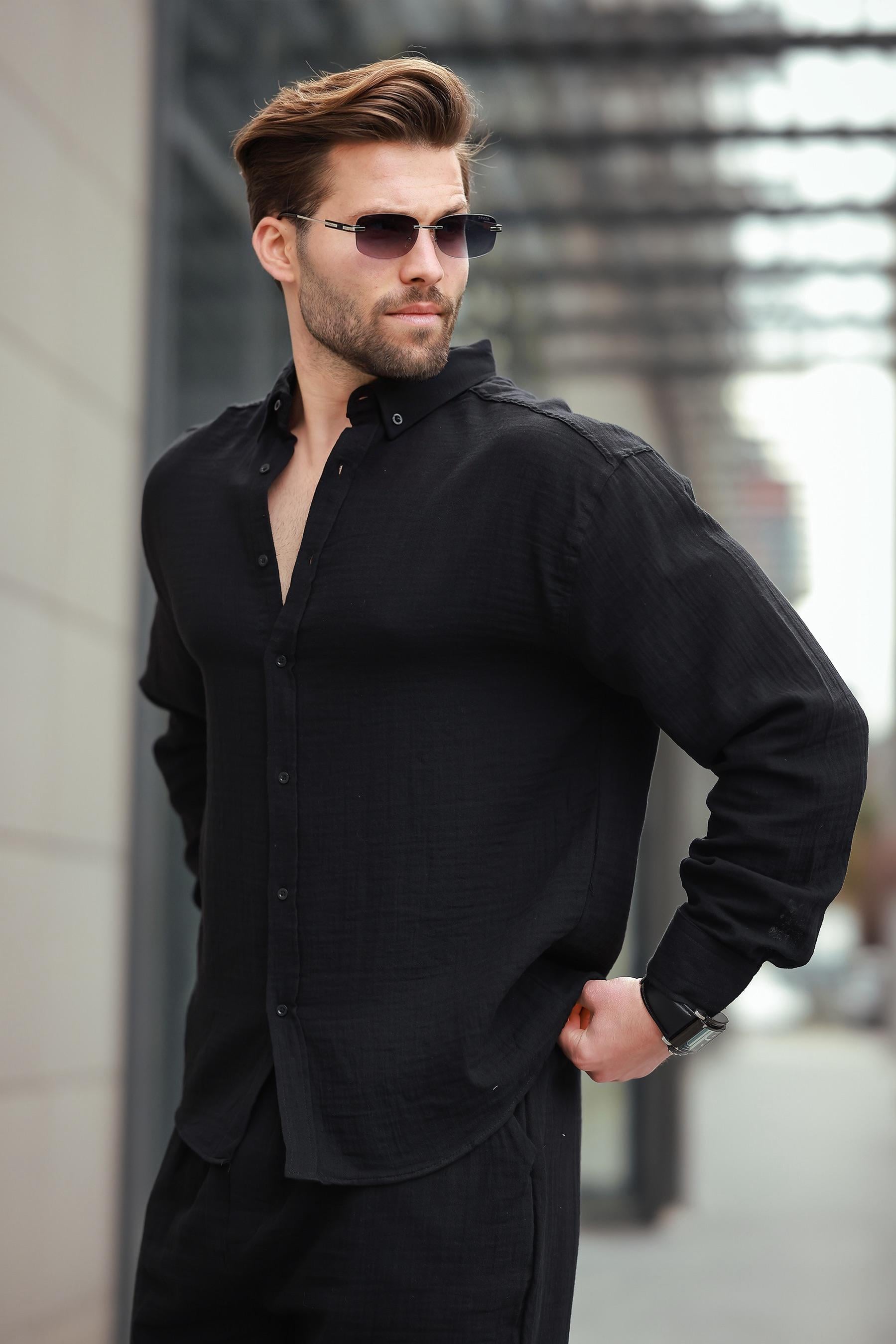 Siyah Basic %100 Pamuklu Uzun Kollu Erkek Gömlek E6761