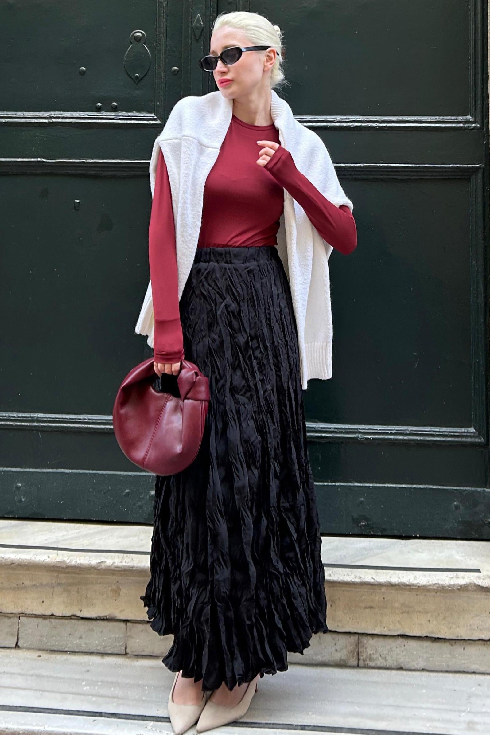 Siyah Kırışık Desen Midi Boy Kadın Etek MG2266