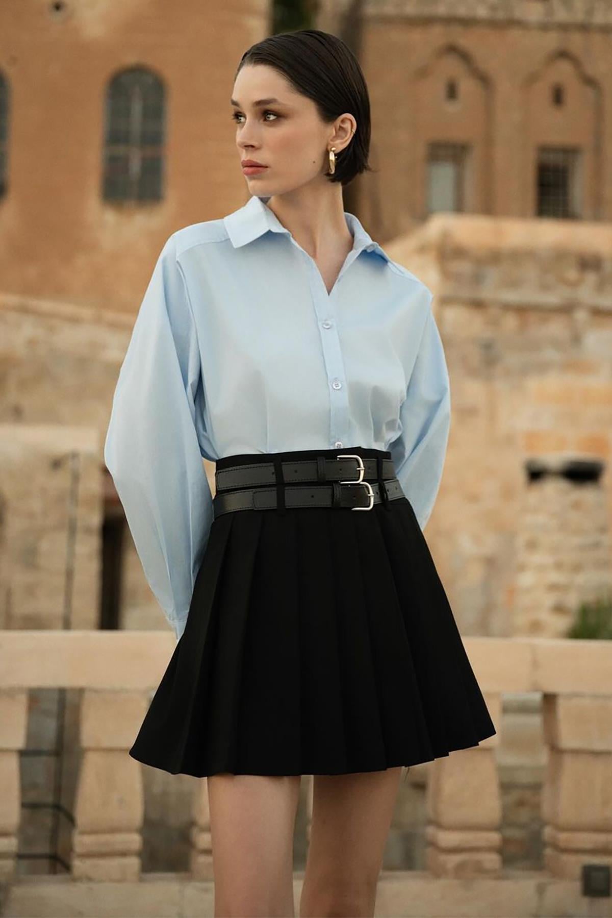 Siyah Pileli İki Kemerli Kadın Etek MG2246
