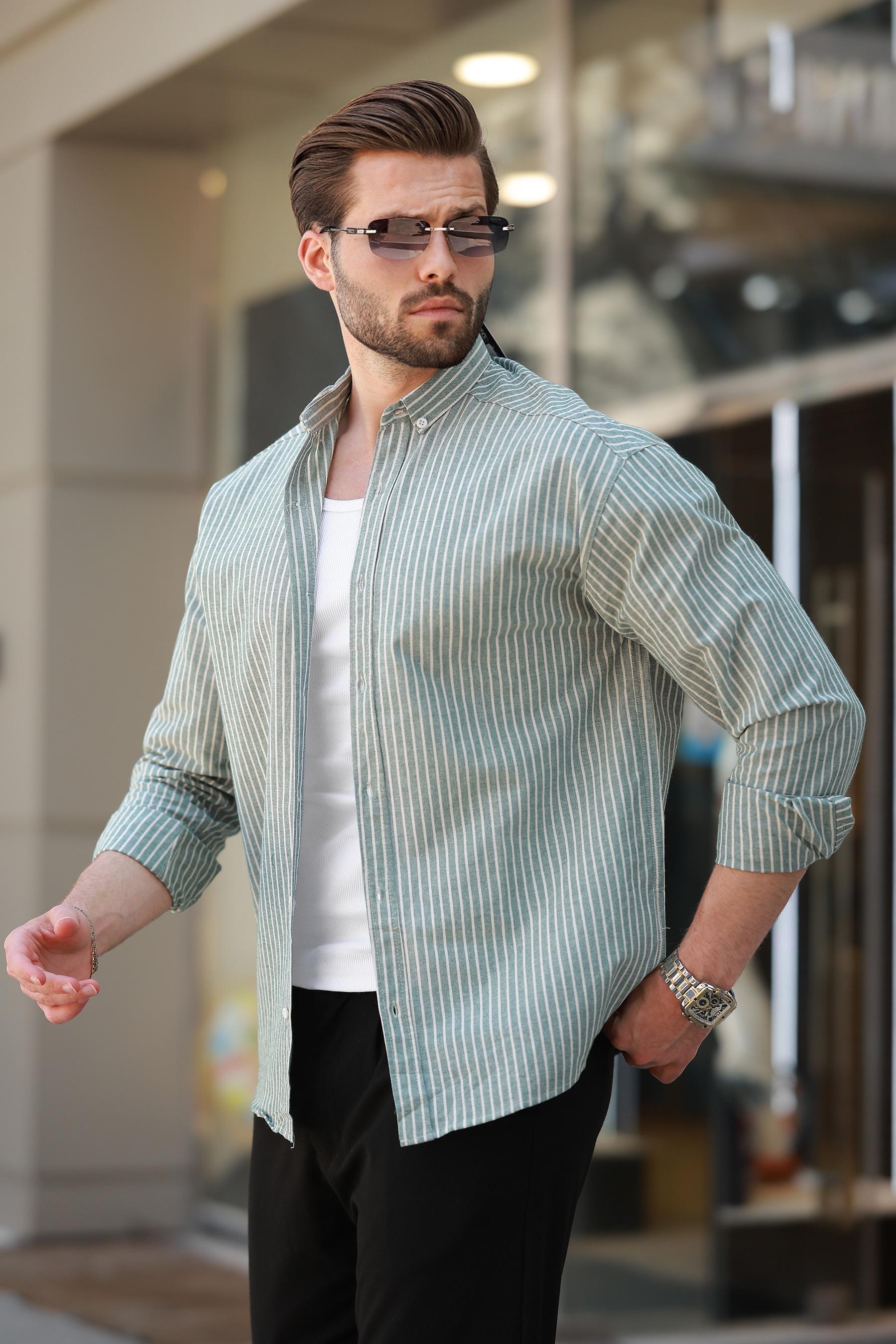 Yeşil Çizgili Uzun Kollu Pamuklu Erkek Gömlek 6746